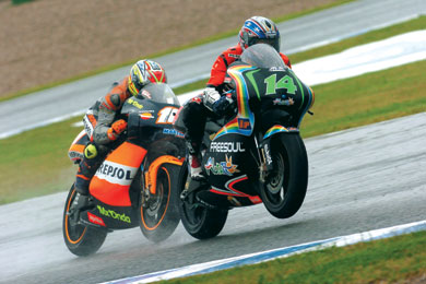 Στην έξοδο της στροφής, η Yamaha του Rossi δεν κατάφερε να βάλει την ισχύ στη βρεγμένη άσφαλτο του Jerez, με αποτέλεσμα να βρεθεί στον αέρα στο 12ο γύρο του αγώνα. Ωστόσο, ο Ιταλός αναβάτης ήταν αρκετά τυχερός, καθ' ότι προσγειώθηκε ξανά στη σέλα της και συνέχισε τον αγώνα, οδηγώντας όμως σε πιο συντηρητικό ρυθμό.