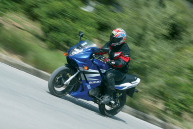 Πρώτη ταχύτητα, το γνωστό "γκλάνγκ" και ξεκινάμε. Ο συμπλέκτης είναι αρκετά προοδευτικός με μία υπόνοια σκληρότητας η οποία θα κουράσει τον πήχη ελάχιστα και μόνο στην αρχή. Η μοτοσικλέτα θα έπρεπε να είχε ζυγιστεί εν…κινήσει, καθώς τότε σίγουρα δεν θα ανέβαζε το δείκτη της ζυγαριάς στα 180 κιλά. Ελαφριά αίσθηση λοιπόν από το δικύλινδρο της Suzuki η οποία υπόσχεται να γίνει ο σύμμαχος του αναβάτη στον πόλεμο της καθημερινής μετακίνησης. Το εξατάχυτο κιβώτιο με το οποίο είναι εξοπλισμένο το GS είναι σωστά ρυθμισμένο βοηθώντας τον αναβάτη τόσο στις χαμηλές όσο και στις υψηλές ταχύτητες αποτελώντας το πρώτο όπλο ενάντια στην κίνηση της πόλης. Οι διακόπτες βρίσκονται εύκολα με γάντια αποτελώντας το κύκνειο άσμα στην προσπάθεια της μοτοσικλέτας να σε κρατήσει προσηλωμένο στην οδήγηση. Πραγματικά, επάνω στο GS αισθάνεσαι και είσαι άνετα. Το μόνο που ίσως θα προβληματίσει περνώντας μέσα στην κίνηση, είναι οι καθρέφτες οι οποίοι εκτείνονται μπροστά και προς τα έξω δίνοντάς σου έτσι την αίσθηση ότι θα τους ακουμπάς σε κάθε πέρασμα. Αυτή η αίσθηση σταματάει να σε φοβίζει μετά από λίγο, καθώς αντιλαμβάνεσαι ότι αποφεύγεις τα εμπόδια πολύ εύκολα, παίζοντας απλά με την μοτοσικλέτα ανάμεσα στα αυτοκίνητα. Δεν θα σε φοβίσουν επίσης και τα φρένα τα οποία είναι μαλακά και προοδευτικά, χωρίς όμως να χάνουν πόντους από την αίσθηση και την αποτελεσματικότητα. Οι μονοί δίσκοι μπροστά και πίσω με την διπίστονη δαγκάνα για τον μπροστινό και μονή για τον πίσω, έχουν αρκετή δύναμη για να σταματήσουν τα 180 κιλά της μοτοσικλέτας. Το κινητήριο σύνολο του GS500F είναι ένα κάπως ώριμο αλλά παρ' όλα αυτά αξιόπιστο δικύλινδρο σε σειρά μοτέρ 487 κυβικών εκατοστών. Τροφοδοτούμενος από δύο καρμπιρατέρ 34 χιλιοστών της Mikuni, ο ελαφρύς και σχετικά μικρών διαστάσεων αερόψυκτος κινητήρας παρέχει αρκετή ροπή ξεκινώντας από την χαμηλή περιοχή των στροφών, όπου όμως παρατηρείται ένα μικρό σκορτσάρισμα ιδιαίτερα όταν προσπαθείς να κινηθείς με δευτέρα ανάμεσα στα μποτιλιαρισμένα αυτοκίνητα. Τίποτε όμως το ανησυχητικό μιας και μόλις ανοίξεις το γκάζι για ακόμα ένα χιλιοστό, το GS αρχίζει να ανεβάζει στροφές ομαλά και αβίαστα. Μπορεί ναι μεν τα 48 του άλογα να μην ακούγονται αρκετά, και ίσως ορισμένες φορές να μην είναι κιόλας, αλλά δεν θα προδώσουν τον αναβάτη ο οποίος θα χρησιμοποιήσει το Suzuki για τις καθημερινές αλλά και μη ανάγκες του.