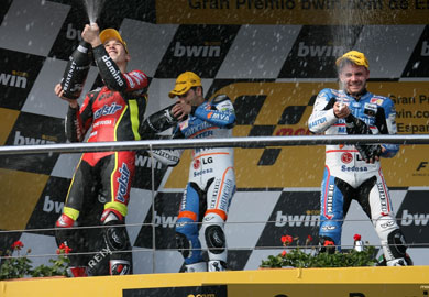 Στο photo finish κρίθηκε ο αγώνας των 125 κυβικών εκατοστών με τον Ούγγρο Gabor Talmacs και την Aprilia του να προλαβαίνει να ανέβει στο πρώτο σκαλί του βάθρου. Με τον ίδιο τρόπο που κατατρόπωσε τον ομόσταυλό του στο Qatar, αιφνιδίασε και τον Τσέχο Lukas Pesek μετά από μία πολύ καλή μονομαχία που είχαν οι δυο τους σε όλο τον αγώνα. Ο Hector Faubel ήταν ο μόνος Ισπανός στο βάθρο και αυτός που εκπροσώπησε τη χώρα στη τρίτη θέση. Τέταρτος τερμάτισε ο Paul Espargaro, ενώ την 5η και 6η θέση συμπλήρωσαν οι Sergio Gadea και Pablo Nieto. Συμπέρασμα; Τα ταλέντα αναβατών στην Ισπανία ανθίζουν…