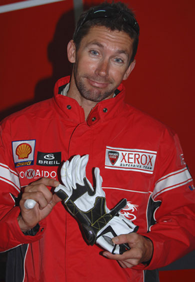 Ο Αυστραλός περσινός παγκόσμιος πρωταθλητής της Ducati, Xerox, Troy Bayliss,είχε αρκετά σκαμπανεβάσματα στον προηγούμενο αγώνα του Donington Park. Μετά τα 38α γενέθλιά του και την pole position πριν τον αγώνα του Σαββάτου, όλα φάνταζαν ιδανικά για μια καλή εμφάνιση! Η μοίρα όμως τα είχε αλλιώς σχεδιασμένα και ένα high-side του κόστισε, στην κυριολεξία, το μικρό δάκτυλο του δεξιού του χεριού. ¶μεσα μεταφέρθηκε στην πλησιέστερη κλινική, όπου και κρίθηκε αναγκαία η αφαίρεση δύο κοκάλων. Αυτό φυσικά δεν τον εμπόδισε να εκμεταλλευθεί τις δύο εβδομάδες που μεσολάβησαν και να επιστρέψει δριμύτερος, αλλά και με μια θέση στο βάθρο της Ισπανίας.