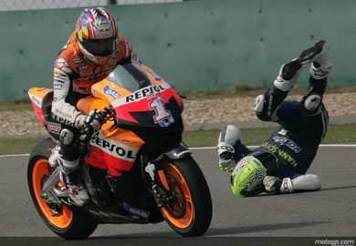 Τα λάθη πληρώνονται, λοιπόν, και αυτό έπαθε για άλλη μια φορά ο “Γιατρός”, που στο 16ο γύρο άνοιξε τη γραμμή του παραπάνω απ’ όσο έπρεπε και έκανε για άλλη μια φορά ένα δώρο στον Casey Stoner που πίεζε. Από εκείνο το σημείο και μετά ο Αυστραλός άνοιξε το γκάζι και με σύμμαχο τα σωστά ελαστικά κρατήθηκε στην κορυφή κάνοντας για άλλη μια φορά επίδειξη ιπποδύναμης με την GP7. Μετά το λάθος του, ο Vale βρέθηκε στην 3η θέση πίσω από το Hopkins, τον οποίο κατάφερε σύντομα να προσπεράσει.