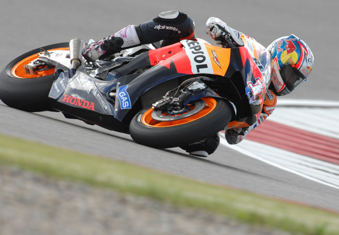 Έτσι κι αλλιώς ποτέ δεν έκανε σπουδαίες εκκινήσεις. Σπαταλάει σχεδόν πάντα τις pole position μένοντας αρκετά πίσω στην πρώτη στροφή. Βέβαια, άλλο να ξεκινάς μέσα στους 5 πρώτους και να ‘‘βλέπεις’’ κορυφή και άλλο να μένεις 3-4 δευτερόλεπτα πίσω, με δέκα αναβάτες μπροστά σου και το Stoner πρώτο να χτίζει ήδη διαφορά από το δεύτερο. Τι έκανε ο Rossi; Απλά, έκλεισε το γκάζι αργότερα από τους άλλους, φρέναρε υποδειγματικά και άρχισε μια τρελή κούρσα απολαυστικών προσπεράσεων.