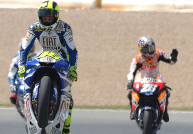 Τα δόντια του, από νωρίς, αποφάσισε να δείξει ο Valentino Rossi. Δίχως “διάβασμα”, δίχως ζέσταμα… Σαν να μπήκε και να ήξερε ακριβώς τι να κάνει. Αυτή τη φορά η ευθεία δεν ήταν αρκετή ώστε οι μοτοσικλέτες να δείξουν το κατά πόσο εξελίχθηκαν μετά την προηγούμενη “ιππική” υπεροχή της Ducati. Απογοητευτική ήταν από την άλλη πλευρά η συμμετοχή του περσινού παγκόσμιου πρωταθλητή Nicky Hayden, που δεν έχει βρει ακόμη τη χρυσή τομή μεταξύ αυτού και της RC212V…