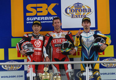 Oι τρεις πρώτοι του Β’ σκέλους: από αριστερά ο Haga, o Bayliss και ο Biaggi.