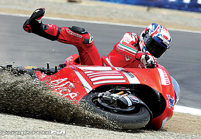 Με 9 γύρους να απομένουν, ο Stoner, προκάλεσε και πάλι το Rossi, όμως ο δεύτερος αρνήθηκε να “παίξει”, με αποτέλεσμα άλλη μια στενή επαφή μεταξύ τους και μία έξοδο για το Stoner στην 11η στροφή. Ο αναβάτης της Ducati όμως είχε το χρόνο να σηκώσει τη μοτοσικλέτα του και να συνεχίσει έχοντας ακόμη να συμπληρώσει 8 γύρους αλλά και 16” απόσταση από το Rossi.