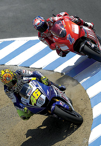 Από τον τρίτο γύρο, κιόλας, ξεκίνησαν οι σκληρές μονομαχίες στις πρώτες θέσεις, καθώς οι δύο αναβάτες οδηγούσαν δίπλα – δίπλα σε πολλά σημεία της πίστας. Οι κοντινές αποστάσεις που είχαν παραλίγο να αποβούν μοιραίες στη γνωστή κατηφορική στροφή – corkscrew- αφού μετά από κάποιες εναλλαγές ο Rossi βγήκε για λίγο από την εσωτερική στο χώμα. Στη συνέχεια βρέθηκε και πάλι στο πλάι του Stoner, που πήρε για λίγο την πρωτιά, την οποία τελικά κατέκτησε ο Valentino.