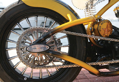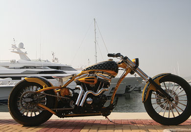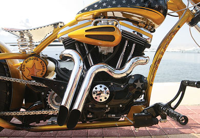 Το χρυσό old school θα τραβήξει την προσοχή από όπου και αν περάσει. Μπορεί το πιρούνι του να μην διαθέτει τόσο μεγάλη κάστερ, αλλά κοιτώντας τη μοτοσικλέτα, στο μυαλό έρχονται σκηνές από την ταινία “Εasy Rider”. Η βαφή της και μόνο είναι ικανή να σε καθηλώσει ώρες, απλώς με το να την χαζεύεις και να βλέπεις τις λεπτομερείς αλλαγές του χρυσού με το μαύρο. Το μικρό, τύπου δάκρυ, ρεζερβουάρ και το εκτεθειμένο στο μάτι πλαίσιο, χαρίζουν την όψη φτιαγμένου Harley προηγούμενης δεκαετίας, τοποθετώντας τη μοτοσικλέτα σε μια κατηγορία που στη γλώσσα των customer ονομάζεται old school. Όσο λιτή δείχνει η κατασκευή τόσο λεπτομέρεια κρύβει σε όλα της τα σημεία. Το αποτέλεσμα είναι άκρως εντυπωσιακό και μοναδικό. Τυχερός ιδιοκτήτης είναι ο Αντρέας που στο Bikers’House υλοποίησε πάνω σε μια μοτοσικλέτα τα ιδιαίτερα γούστα του και μέρος της προσωπικότητάς του. Το ροκαμπίλικο στιλ και ο ιδιαίτερος τρόπος ζωής του απασχόλησε τους ανθρώπους που κρύβονται πίσω από το Bikers’ House, οι οποίοι βάλθηκαν να πραγματοποιήσουν το όραμά του. Τα λόγια του Σπύρου σε ό,τι αφορά το project της συγκεκριμένης μοτοσικλέτας, είναι χαρακτηριστικά: «Το πρόβλημα ήταν πως ο Αντρέας έλειπε για επαγγελματικούς λόγους εκτός Αθηνών, με αποτέλεσμα να μην είναι παρών στα στάδια εξέλιξης της μοτοσικλέτας. Αυτό είχε ένα επιπρόσθετο βάρος ευθύνης για εμάς. Το τελικό αποτέλεσμα μάς δικαίωσε και άφησε τον πελάτη μας κατενθουσιασμένο, μιας και ήταν ό,τι είχε φανταστεί». Ο κινητήρας ανήκει στην Harley Davidson, βελτιωμένος σε μεγάλο βαθμό, και είναι το μοναδικό στοιχείο που υπάρχει πάνω στη μοτοσικλέτα από την αμερικάνικη εταιρεία.