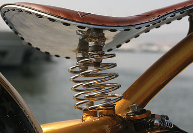 Η σέλα είναι χειροποίητη και μιας και δεν υπάρχει πίσω ανάρτηση, τα ελατήριά της φροντίζουν για την άνεση του αναβάτη.