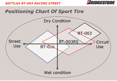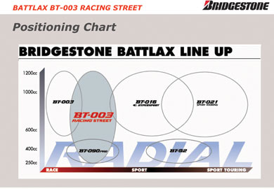 Η Bridgestone με τη δημιουργία του BT-003 RS προσπαθεί να καλύψει το κενό μεταξύ του BT-016 Hypersport που επικεντρώνεται στη σπορ χρήση εισχωρώντας προς το sport-turing και του BT-003 που είναι ένα ελαστικό με racing χαρακτηριστικά. Επίσης, τα BT-003 RS καλύπτουν ένα ευρύτερο πεδίο μοτοσικλετών, μιας και μπορούν να φορεθούν σε μοτοσικλέτες από 250 έως και 1200 κ.εκ. Διαθέτοντας την τεχνογνωσία των κορυφαίων ΒΤ-003, τα νέα racing street κρίνονται ιδανικά για τη sport οδήγηση. Επίσης η συγγένειά τους με τα BT-016 τα κάνει να αντεπεξέρχονται θετικά στο βρεγμένο και να έχουν χαρακτηριστικά μακροζωίας.