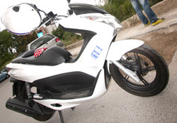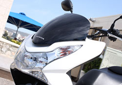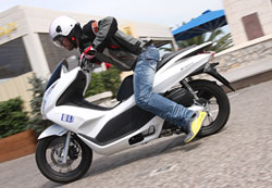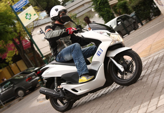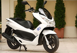 scooter της Honda. Το "γλυκούλι" PCX υιοθετεί την ανάγλυφη μανία που διακατέχει τους σχεδιαστές της Honda τον τελευταίο καιρό και μοιάζει κι αυτό με τη σειρά του σαν μια κάψουλα. Το κοστούμι, σε ένα ενιαίο σύνολο, φαντάζει λες και έχει ενσωματωμένη ακόμα και τη σέλα πάνω του. Φυσικά, πέραν του σχεδιασμού, στην παραπάνω εντύπωση συμβάλλουν και τα πολύ προσεκτικά εφαρμοσμένα πλαστικά. Όπως στα DN-01 και VFR 1200F, έτσι και στο PCX, ο μεγαλύτερος όγκος βρίσκεται στο εμπρός μέρος και συγκεκριμένα στη μάσκα, αφήνοντας τις μίνιμαλ σχεδιαστικές ανησυχίες για την ουρά. Μεγάλη εντύπωση προκαλεί επίσης η διαμόρφωση της ποδιάς που αποτελείται ουσιαστικά από ενιαία τμήματα πλαστικών επιφανειών, ως φυσική συνέχεια της μάσκας. Η εκτέλεση του όλου εγχειρήματος κρίνεται εντυπωσιακή και πρωτότυπη! Η φιλοσοφία της επίπεδης ποδιάς των SH εγκαταλείφθηκε στο PCX και στο κενό ανάμεσα στα κάτω άκρα του οδηγού "φωλιάζει" το ρεζερβουάρ, επιτρέποντας με αυτόν τον τρόπο στο χώρο κάτω από τη σέλα να είναι άπλετος.