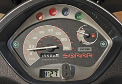 Η συμπεριφορά του scooter είναι φιλική από κάθε άποψη. Ο κινητήρας δεν θα τρομάξει με απότομες εκκινήσεις, αλλά και δεν θα απογοητεύσει με τις επιδόσεις του. Αναρτήσεις και πλαίσιο συνεργάζονται άψογα, με αποτέλεσμα το Sonar να δίνει μια μαλακή αίσθηση, χωρίς, ωστόσο, να παραπονιέται υπό κλίση ή να "λυγίζει" υπό πίεση. Τέλος, τα φρένα έχουν την απαραίτητη δύναμη, ώστε να ακινητοποιήσουν άμεσα το μικρόσωμο scooter, χωρίς όμως να τρομάξουν με απότομη συμπεριφορά ή απροσδόκητα μπλοκαρίσματα.
