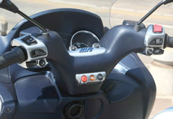 Οι διαφορές ανάμεσα στο υβριδικό και ένα απλό MP3 θα φανούν αν πλησιάσεις τον πίνακα των οργάνων. Εκεί, στη θέση του στροφόμετρου βρίσκεται η ένδειξη των μπαταριών, ενώ στην κεντρική ψηφιακή οθόνη μπορεί να διακρίνει ο αναβάτης το mode οδήγησης που έχει επιλέξει. Φυσικά, μια μικρή αλλαγή υπάρχει και στα μπουτόν που βρίσκονται στο τιμόνι. Δεξιά υπάρχει το κουμπί επιλογής mode και αριστερά ένα ακόμη κουμπί δίπλα στην κόρνα. Πρόκειται για μια δεύτερη κόρνα μικρότερης έντασης, η οποία λειτουργεί σε πεζόδρομους κ.λπ. (όταν το MP3 κινείται ηλεκτρικά), προκειμένου να μην τρομάζει τους πεζούς.