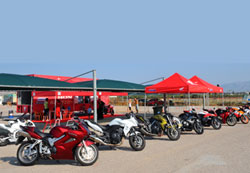 Οκτώ μοτοσικλέτες της Honda, όλες εξοπλισμένες με C-ABS, περιμένουν για να τις οδηγήσουμε.