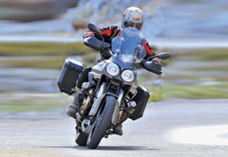 Πρώτα απ’ όλα, πρόκειται για μια ιδιαίτερα άνετη μοτοσικλέτα, η οποία δεν θα προβληματίσει εντός ή εκτός δρόμου. Η σέλα και η μεγάλη ζελατίνα θα εκτιμηθούν στο ταξίδι, ενώ το μεγάλο σε διαστάσεις τιμόνι τοποθετεί τα χέρια ανοιχτά και ψηλά, κάτι που ευνοεί την κίνηση εκτός δρόμου. Η μέγιστη απόδοση του μοτέρ ανέρχεται στους 105 ίππους στις 7.500 σ.α.λ. και η ροπή, που ξεπερνά τα 11 kgm, φτάνει τη μέγιστη τιμή της στις 6.400 σ.α.λ. Επιπλέον, η μετάδοση στον πίσω τροχό πραγματοποιείται παραδοσιακά μέσω του άξονα CARC της Moto Guzzi. Τέλος, η ακαμψία του συνόλου γίνεται φανερή και από τις επιλογές στο πακέτο των αναρτήσεων -ένα πλήρως ρυθμιζόμενο πιρούνι της Marzocchi με διάμετρο καλαμιών 50 χιλ. και ένα αμορτισέρ της Sachs με διαδρομή 155 χιλ.