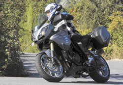 Με το πρώτο βλέμμα πάνω του καταλαβαίνεις ότι το συγκεκριμένο μοντέλο είναι διαφορετικό από τα άλλα. Η επιθετική του αισθητική βασίζεται κυρί­ως στις γωνίες της μάσκας και το αιχμηρό φωτιστικό σώμα, καθώς και σε άλλα χαρακτηριστικά που μοιάζουν δανεισμένα από επιθετική street μοτοσικλέτα. Το καλύτερο στοιχείο του Tiger, το εν σειρά τρικύλινδρο μοτέρ των 1.050 κ.εκ., έχει μέγιστη ισχύ 113 ίππους στις 9.400 σ.α.λ. Σε υψηλά επίπεδα κινείται και η ροπή του, με μέγιστη τιμή 10,1 kgm από τις 6.250 σ.α.λ. Τέλος, φρένα και αναρτήσεις φέρουν αξιόπιστες υπογραφές (Nissin και Showa αντίστοιχα) και συμβάλλουν στην εξαιρετική οδική συμπεριφορά του Triumph.