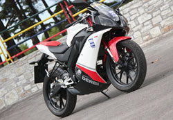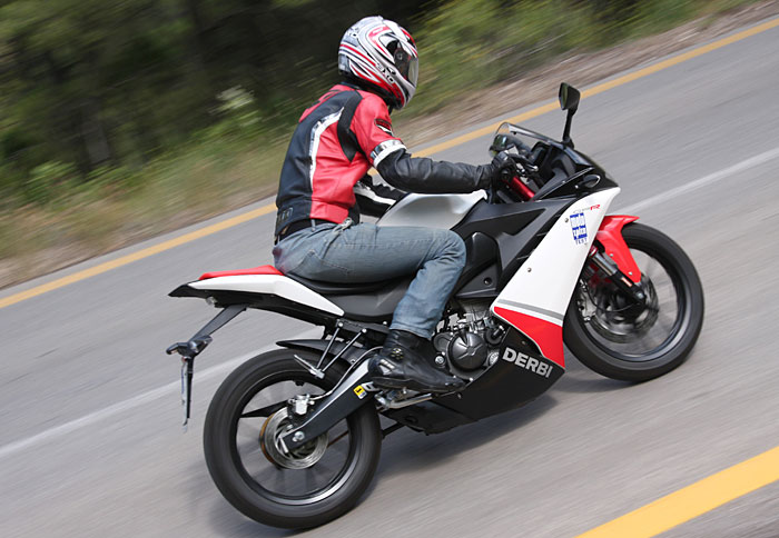 Μπορεί το sport μοτοσικλετάκι της Derbi να σε προϊδεάζει με την εμφάνιση του ότι βασικό του τερέν είναι η πίστα, ωστόσο, εκεί που θα διαπρέψει είναι η πόλη.  Μπορεί η άνεση να μη βρίσκεται σε υψηλά επίπεδα, η εργονομία του, όμως, θα σου επιτρέψει να κάνεις αρκετά χιλιόμετρα πριν κουραστείς. Επίσης, η συνολική του συμπεριφορά μπορεί να κριθεί φιλική, με συνέπεια η καθημερινή κίνηση στην πόλη να είναι εύκολη υπόθεση στη σέλα του. Και, φυσικά, μπορείς να εκμεταλλευτείς τα sport χαρακτηριστικά του, με το αστικό τοπίο να αποτελεί το background του παιχνιδιού σου.  Με ένα τσίμπημα του συμπλέκτη στο φανάρι, η ράθυμη εκκίνησή του μπορεί να γίνει γρηγορότερη και με λίγη προπόνηση, το ζιγκ-ζαγκ ανάμεσα στα αυτοκίνητα να σε κάνει να νιώθεις ότι περνάς τον αντίπαλό σου από την εσωτερική της Curva Peluqui της Jerez.  Το μικρό του βάρος θα σε βοηθήσει στους ελιγμούς ανάμεσα σε ακινητοποιημένα αυτοκίνητα, το τιμόνι, όμως, δεν διαθέτει μεγάλο κόψιμο.  Μικρό το κακό! Αν πήξεις στην πόλη, το μόνο που έχεις να κάνεις είναι να επισκεφτείς μια κοντινή πίστα ή να ξεχυθείς σε μια περιαστική διαδρομή με αξιοπρεπή άσφαλτο και πολλές στροφές.  Εκεί, το GPR θα κινηθεί γρήγορα, αρκεί να κρατάς τη λειτουργία του κινητήρα στις υψηλές στροφές, και οι εναλλαγές κατεύθυνσης θα πραγματοποιηθούν με τη σκέψη, χάρη στο μικρό του βάρος και την εξαιρετική συνεργασία μεταξύ πλαισίου και αναρτήσεων.  Η τελευταία συμβάλλει και στο γεγονός ότι τα όρια του GPR υπό κλίση θα αργήσουν να φανούν. Επίσης, τα χαρακτηριστικά της entry level κατηγορίας που φέρει, θα σε συγχωρήσουν σε κάποιο λάθος, γεγονός που το καθιστά ένα ιδανικό sport σχολείο.