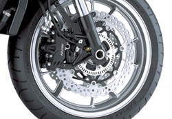 Στο μπροστινό φρένο συναντάμε δύο ημίπλευστους δίσκους 310 χιλ. με ακτινικές τετραπίστονες δαγκάνες και ABS.