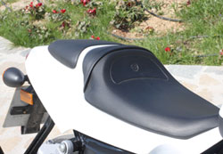 Άνετη, με ποιοτικό κάλυμμα και το logo της εταιρείας η σέλα του αναβάτη, όμως η σέλα του συνεπιβάτη είναι λεπτή, και δεν θα βολέψει.