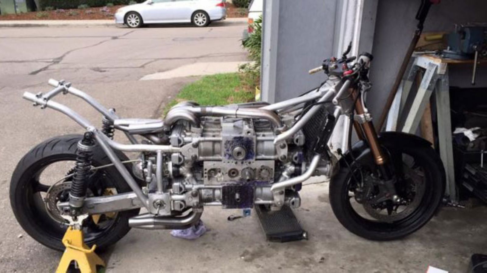 Για το συγκεκριμένο project αυτή τη φορά, χρησιμοποίησε τέσσερις κινητήρες από Yamaha YZF 600 (599κ.εκ. 4κύλινδρος εν σειρά) και κατασκεύασε ένα ¨τέρας¨ 16 κυλίνδρων διάταξης Η και 2396κ.εκ.