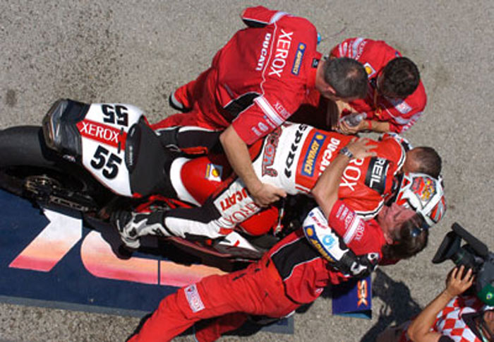 Έκλεισε την ψαλίδα ο Laconi από τον πρωτοπόρο της βαθμολογίας στο φετινό πρωτάθλημα Superbike Troy Corser, στους 92 βαθμούς, τρέφοντας έτσι ελπίδες για την ομάδα του και την πιθανή διεκδίκηση στο πρωτάθλημα των κατασκευαστών. Ο Crorser περιορίστηκε στην 3η θέση και στους δυο αγώνες και παρέμεινε η Suzuki Corona Extra μπροστά από την Ducati στο πρωτάθλημα κατασκευαστών με 63 βαθμούς. Και ο Vermeulen είχε την ίδια επίδοση με συνέπεια να πάρει την 2η θέση και στους δυο αγώνες. Από την διοίκηση της Ducati δήλωσαν πως επάξια κέρδισε ο Laconi και τους δυο αγώνες, καθώς πραγματοποίησε πολύ καλή εμφάνιση και βέβαια ρόλο σε αυτό έπαιξε και το ότι το συγκεκριμένο circuit ευνοεί την Ducati, διότι έχει πολλούς υποστηρικτές και είναι σαν να αγωνίζονται στην έδρα τους.