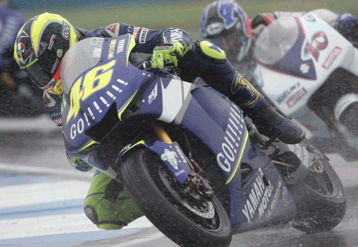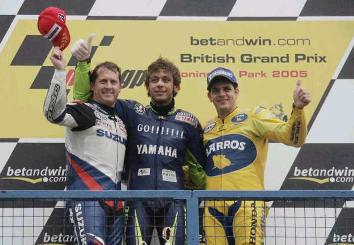 Εφτά γύρους πριν το τέλος του αγώνα και ενώ μέχρι εκείνη την στιγμή εναλλάσσονταν οι πρώτες τέσσερις θέσεις μεταξύ των Kenny Roberts, Alex Barros, Colin Edwards και του παγκόσμιου πρωταθλητή Valentino Rossi, έκανε την επίθεσή του και φτιάχνοντας διαφορά κάτι λιγότερο από 1 δευτερόλεπτο πήρε την νίκη στο αγγλικό circuit που διεξήχθη υπό καταρρακτώδη βροχή. Ο ίδιος δήλωσε: «ήταν ένας από τους δυσκολότερους αγώνες της καριέρας μου. Είχε πολύ κρύο και η πίστα ήταν αρκετά γλιστερή. Πραγματικά αισθανόμουν σαν να καβαλούσα πλοίο και όχι μοτοσικλέτα, διότι υπήρχε πάρα πολύ νερό μεταξύ των ελαστικών και του οδοστρώματος. Συνέχεια σπινάριζε το πίσω ελαστικό και μπλόκαρε το μπροστινό. Προσπαθούσα γύρο με τον γύρο να καταλάβω σε ποια σημεία της πίστας μπορούσα να πιέσω την μοτοσικλέτα περισσότερο». Ο ιταλός παίρνοντας την καρό σημαία, πανηγύρισε με την χαρακτηριστική κίνηση, να σηκωθεί όρθιος στην Μ1 και να προσποιηθεί ότι παίζει βιολί. Ο ίδιος έδωσε την εξήγηση για τον πανηγυρισμό λέγοντας ότι: «παίρνοντας την pole position στα δοκιμαστικά το θεώρησα ‘τέχνη’, όπως το βιολί». Δεύτερη θέση για τον αναβάτη της Team Suzuki, τον αμερικανό Kenny Roberts, ο οποίος ανεβαίνει για πρώτη φορά φέτος στο βάθρο. Ο Alex Barros, γιόρτασε την 250η συμμετοχή του στους αγώνες του Moto GP, ανεβαίνοντας στο 3ο σκαλί του βάθρου. Ο έτερος αναβάτης της Gauloises Yamaha Team, Colin Edwards, πήρε την 4η θέση, ενώ την πεντάδα έκλεισε ο Carlos Checa για λογαριασμό της Ducati Marlboro Team. Ο Biaggi άνοιξε τον χορό των εξόδων για να ακολουθήσουν ο Melandri, ο Gibernau, ο Bayliss, ο Hayden και ο Hopkins που έπεσαν θύματα της βροχής. Οι Capirossi, Tamada, Hoffman, Elias και Rolfo έκλεισαν την 10αδα. Ο Hopkins ήταν ο μόνος αναβάτης που κατάφερε να συνεχίσει μετά την πτώση του και να τερματίσει 2 γύρους πίσω καθώς η μοτοσικλέτα του δεν έπαθε σοβαρές ζημιές.