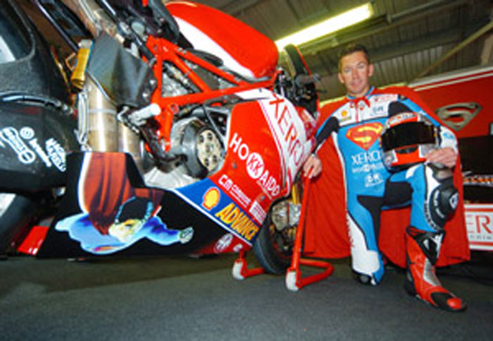 Για χάρη του promotion ο Αυστραλός αναβάτης της Ducati Xerox φόρεσε την ειδικά σχεδιασμένη για την περίσταση δερμάτινη φόρμα με τα γραφικά του Superman και δεν έμεινε τίποτα άλλο παρά να αποδείξει την αξία του και να κουβαλήσει άξια τον τίτλο του υπερ-ήρωα!