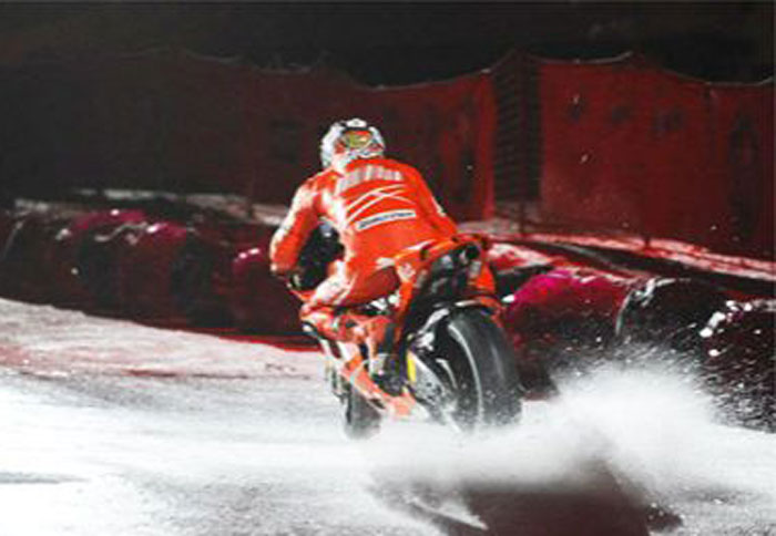 Με την πρόκληση να δαμάσει τα 200+ άλογα μιας Desmosedici , ο Vittoriano Guareschi άρχισε να δημιουργεί ένα σύννεφο από πάγο γλιστρώντας επιδέξια πάνω στην επιφάνεια της λίμνης με το πλήθος να ζητοκραυγάζει. Αφού αποχαιρέτισε το κοινό ο Guareschi, φορώντας την κανονική δερμάτινη φόρμα του αποχώρησε στην ειδικά θερμενομενη σκηνή που ειχέ στηθεί λιγο πιο πέρα. Για την εμφάνιση αυτή η Desmosedici ήταν εξοπλισμένη με ειδικά λάστιχα με καρφιά αλλά και ειδικά χαλύβδινα δισκόφρενα.