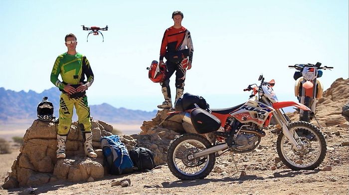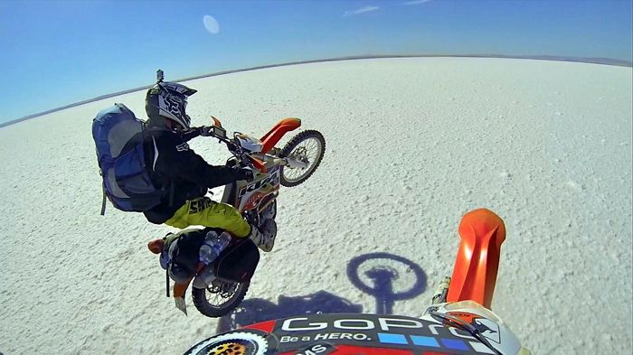 γ) Στο ίδιο το ταξίδι. Χαλαροί, συντηρητικοί, λογικοί ρυθμοί ταξιδιού; Χα, χα, ας γελάσω! Ο Adam Riemann και οι φίλοι του (άγνωστο πόσα KTM συμμετείχαν στην περιπέτεια, πάντως τουλάχιστον 2, αν όχι περισσότερα) σουζάρουν διαρκώς, πλαγιολισθαίνουν και σκαρφαλώνουν σε κάθετους λόφους, διασχίζοντας γκαζωμένοι ερήμους και μονοπάτια! Μιλάμε για κάθετες σούζες, σούζες διαρκείας, power wheelies, συγχρονισμένες σούζες, και ότι άλλο μπορεί να διανοηθεί ο ανθρώπινος νους. Οδηγική απόλαυση; Ω ναι!