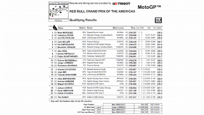 Στο Q2 ο Marquez ξεκαθάρισε το τοπίο εξ` αρχής επιτυγχάνοντας την έβδομη στην σειρά pole position σχεδόν τρία δέκατα ταχύτερος από τον απίστευτο Rossi, ο οποίος για άλλη μια φορά αποδεικνύει ότι η ηλικία του τον αφήνει παγερά αδιάφορο…