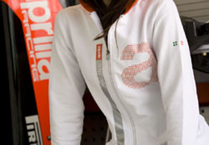 Γυναικεία, βαμβακερή ζακέτα με φερμουάρ, σε λευκό χρώμα. Έχει κόκκινη κουκούλα και στάμπα Aprilia (a) στο στήθος και στο πίσω μέρος αντίστοιχα.
