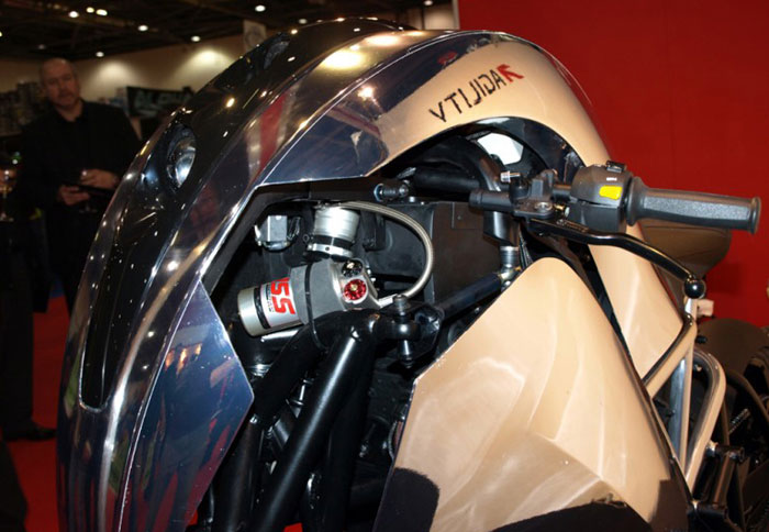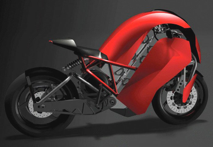 Ούτως ή άλλως ο σχεδιαστής ξεκίνησε τη συγκεκριμένη μοτοσικλέτα από λευκό χαρτί και τη δημιούργησε χωρίς τους συμβιβασμούς που υπάρχουν για τις μοτοσικλέτες με κινητήρα εσωτερικής καύσης. Αυτή ακριβώς την εντολή έδωσε και στους σχεδιαστές των αναρτήσεων, το όνομα των οποίων δεν αποκάλυψε. Όπως λέει και ο ίδιος, «το πιρούνι είναι ένας πολύ πρακτικός τύπος ανάρτησης αν έχεις να βολέψεις ένα ψυγείο για την ψύξη του κινητήρα και τις εξαγωγές της εξάτμισης μεταξύ του τελευταίου και του εμπρός τροχού. Δεν είναί όμως τόσο αποδοτικό για την πρόσφυση.»