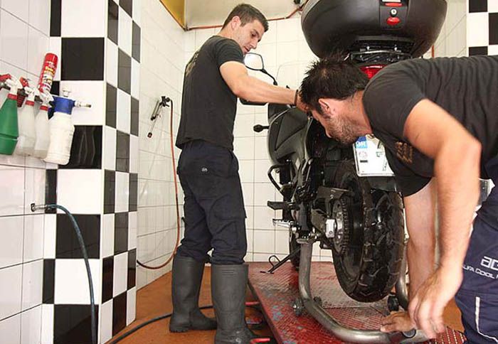 Σε ένα εξειδικευμένο πλυντήριο μοτοσικλετών μπορεί να υπάρχει ράμπα, που διευκολύνει ακόμα περισσότερο.
