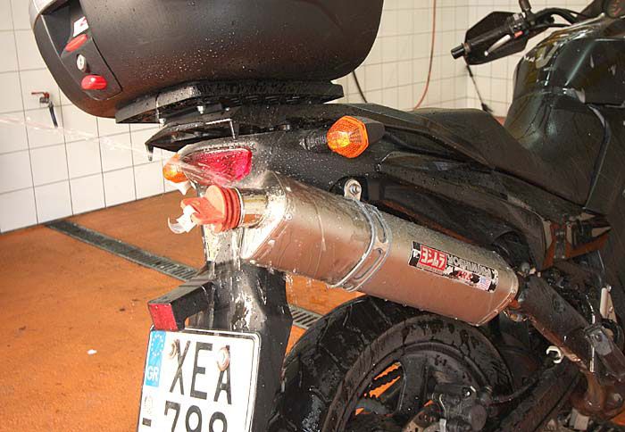 5. Στη συνέχεια ξεπλένουμε καλά τα σημεία που μόλις καθαρίσαμε, ενώ καταβρέχουμε και όλη τη μοτοσικλέτα, προκειμένου να διώξουμε τις σκόνες και το χώμα που έχουν καθίσει στα υπόλοιπα σημεία της.