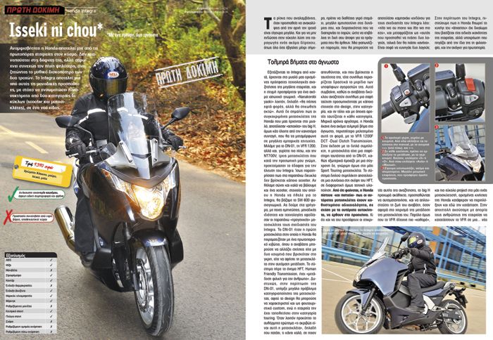 Το πρώτο είδος είναι το νέο και φέρει πάνω του το λογότυπο της Honda. Δοκιμάζουμε πρώτοι το Integra, το δίκυκλο που διαθέτει στοιχεία από τον κόσμο του scooter και της μοτοσικλέτας και ξεχωρίζει για την οδική του συμπεριφορά και τη χαμηλή του κατανάλωση.