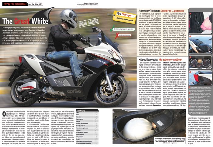 Η πρώτη διάθεση οφείλεται στο Aprilia SRV 850, το οποίο δοκιμάζουμε πρώτοι και διαπιστώνουμε από πρώτο χέρι πώς είναι να οδηγείς το ταχύτερο και ισχυρότερο scooter του κόσμου. Η ανωτερότητα του χαρακτήρα του δικαιολογείται από τους 76 ίππους και τα 210 χλμ./ώρα τελικής και το SRV 850 συμπεριφέρεται σαν μοτοσικλέτα, χάρη στο στήσιμό του.