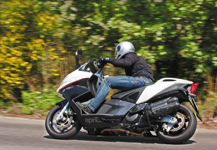 scooter. Είναι σωληνωτό διπλής ραχοκοκαλιάς ανοιχτό στο κάτω μέρος του και ο κινητήρας δένει πάνω σε αυτό μέσω σινεμπλόκ. Πάνω του στηρίζεται και το θηριώδες, για τα μέτρα των scooter, αλουμινένιο ψαλίδι που αναρτάται από οριζόντια τοποθετημένο-με μοχλικό-αμορτισέρ ρυθμιζόμενο σε επτά θέσεις ως προς την προφόρτιση. Ένα συμβατικό πιρούνι χωρίς ρυθμίσεις με καλάμια διαμέτρου 41 χλστ. έχει τοποθετηθεί στο εμπρόσθιο μέρος. Οι μηχανικοί προχώρησαν στην αλλαγή του set up των αναρτήσεων με στόχο την ποιοτικότερη λειτουργία τους και τη καλύτερη διαχείριση των δυνάμεων που αναπτύσσονται. Όσον αφορά στο τομέα της πέδησης, το μοντέλο της Aprilia συνεχίζει στα χνάρια του Gilera GP 800 με δύο δίσκους 300 χλστ. και διπίστονες δαγκάνες της Brembo μπροστά, και ένα δίσκο 280 χλστ. για τον πίσω τροχό που συνεργάζεται επίσης με δαγκάνα δύο εμβόλων.