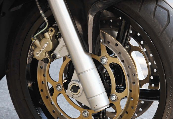 scooter να…κολυμπούν δεξιά και αριστερά όσο πιο μακριά γίνεται από το ιταλικό μοντέλο γιατί σε ευθεία γραμμή δεν έχουν καμία απολύτως τύχη. Αυτή η πανίσχυρη «ουρά» με τις τέσσερις βαλβίδες και τον ένα εκκεντροφόρο σε κάθε κεφαλή αποδίδει 76 ίππους και 7,8 κιλά ροπής στις 7.750 και 6.000 σ.α.λ. αντίστοιχα και κάνει όλα τα άλλα μεγάλα   scooterόψαρα να μοιάζουν με γόπες μπροστά του. Σε σχέση με το μοτέρ του GP 800, το SRV, φέρει δύο νέους αισθητήρες λάμδα, ένα για κάθε κύλινδρο, για ακόμη καλύτερη καύση του μίγματος.
