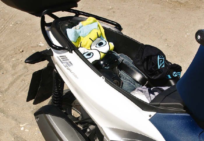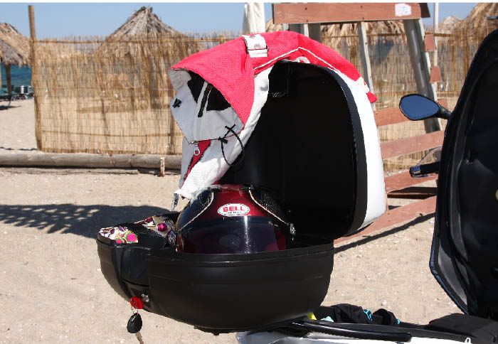 Και να φανταστείτε ότι ο γάντζος στην ποδιά έμεινε αχρησιμοποίητος! Και μόλις πατήσαμε στην παραλία, οι χώροι αυτοί άδειασαν, για να φιλοξενηθούν με εξίσου μεγάλη άνεση τα κράνη και τα μπουφάν μας.
