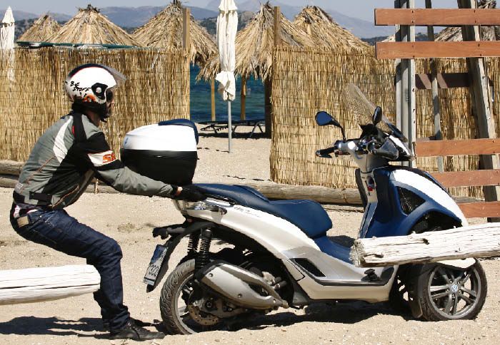 Όπως είναι φυσικό, ο τρίτος τροχός δίνει ένα μεγάλο πλεονέκτημα στο Yourban, σε σύγκριση με ένα κοινό scooter. Αρκετά μέτρα πριν μας υποδεχθεί το γαλάζιο της θάλασσας, ένα σύννεφο σκόνης προανήγγειλε την ύπαρξη χωματόδρομου. Το τρίτροχο της Piaggio, όμως, όχι μόνο δεν πτοήθηκε, αλλά το καταδιασκέδασε! Ο τρίτος τροχός χαρίζει μεγαλύτερη σταθερότητα (και, φυσικά, μεγαλύτερη σιγουριά στον αναβάτη) στο Yourban και το μικρό του βάρος – σε σχέση με τα υπόλοιπα MP3 – δεν αποκλείει το παιχνίδι στο χώμα. Επιπλέον, οι επιτόπιοι ελιγμοί σε αναστροφές και παρκάρισμα γίνονται με μεγαλύτερη ασφάλεια, ακόμη κι αν κάποιος τροχός γλιστρήσει. Τέλος, το Yourban μπορεί να κινηθεί δειλά και σε αμμώδες περιβάλλον, αλλά όχι για πολύ. Τα ελαστικά του παραμένουν ασφάλτινα και πολύ σύντομα, το scooter θα κολλήσει στην άμμο. Σε αυτή την περίπτωση, θα ξεπεράσετε το πρόβλημα του βάρους του και θα νιώσετε ευγνώμονες που μπορεί να σταθεί όρθιο (χάρη στο κλείδωμα των μπροστινών τροχών) και να το τραβήξετε με δύναμη από πίσω, εωσότου ξεκολλήσει.