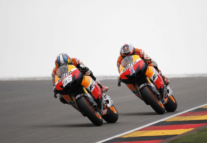 Πάμε να δούμε τώρα ποιος κέρδισε τις μάχες των ομάδων. Στην κορυφή, ο Stoner κάποια στιγμή πέρασε μπροστά, όμως ο Pedrosa φαινόταν αποφασισμένος, αλάνθαστος, και σταθερός, και λίγο πριν το τέλος, πέρασε και πάλι μπροστά. Δύο μόνο στροφές πριν από την καρό σημαία, ο Stoner έκανε ένα σπάνιο για αυτόν λάθος, κι έπεσε, χαρίζοντας μια ανέλπιστη πρωτιά στον Ισπανό αναβάτη της Repsol, που πέρασε έτσι δεύτερος στο πρωτάθλημα. Έτσι, ο Pedrosa γιόρτασε την πρώτη του νίκη για φέτος, όμως μαζί του γιόρτασε και ο Lorenzo, που πέρασε πρώτος στο πρωτάθλημα. Καθόλου δεν γιόρτασε ο Αυστραλός, αφού από πρώτος έπεσε στην τρίτη θέση, και πλέον το πρωτάθλημα ανεβαίνει σε βαθμό δυσκολίας.