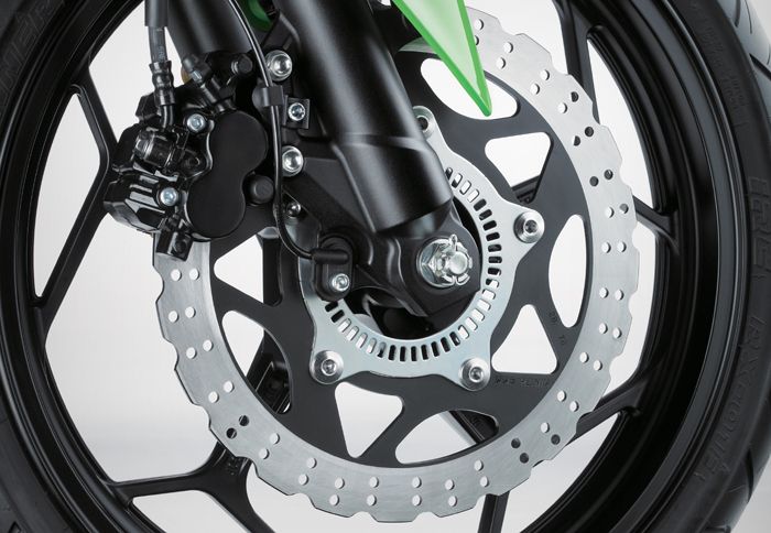 Το σημαντικότερο στοιχείο στα φρένα του Kawasaki Ninja 300R είναι το προαιρετικό σύστημα ABS. Φέρει την υπογραφή της Nissin και πρόκειται, σύμφωνα με την Kawasaki, με τη μικρότερη μονάδα που έχει χρησιμοποιηθεί, καθώς είναι κατά 60% μικρότερη από προηγούμενες μονάδες της Nissin και κατά 775 γραμμάρια ελαφρύτερη. Δυστυχώς, στη Φρανκφούρτη δεν είχαμε την ευκαιρία να οδηγήσουμε την έκδοση με το ABS, καθώς αυτή είχε μόλις μπει στην παραγωγή.
