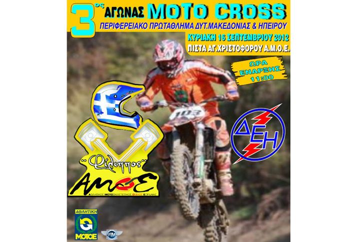 Το Αθλητικό σωματείο «Αθλητικός Μοτοσικλετιστικός Όμιλος Εορδαίας» (ΑΜΟΕ), διοργανώνει τον 3o αγώνα Μotocross του 6ου Περιφερειακού Πρωταθλήματος Δυτικής Μακεδονίας για το 2012. Ο αγώνας θα γίνει την Κυριακή 16 Σεπτεμβρίου 2012 στην Πίστα Μοτοcross A.M.O.E. Aγ.Χριστόφορου, στην περιοχή «αποθέσεις ΔΕΗ». Η διαδρομή του αγώνα έχει μήκος 1610 μ. με ελάχιστο πλάτος 9μ. τεχνική.