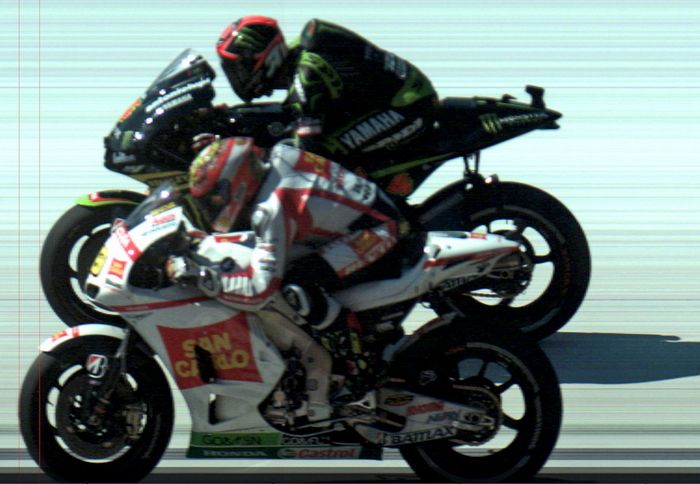 Ο Abraham αναγκάστηκε να αλλάξει μοτοσικλέτα, και να εκκινήσει από τα pits, όμως ένα δεύτερο τεχνικό πρόβλημα με το πίσω φρένο, τον οδήγησε σε πτώση και εγκατάλειψη, από τον πρώτο κιόλας γύρο. Με τα φώτα να έχουν σβήσει, ο Lorenzo πετάχτηκε μπροστά και εξαφανίστηκε, ακολουθούμενος από τον… Rossi! Τον Ιταλό απειλούσε ο Bradl στην αρχή, όμως κατόπιν άρχισε να χάνει έδαφος, αφήνοντας τον γιατρό να πάρει με την ησυχία του το δεύτερο βάθρο με τη Ducati για το 2012. Ας γυρίσουμε όμως στη συνεχιζόμενη κακοτυχία του Pedrosa, ο οποίος άρχισε 21ος και μέσα σε λίγες μόνο στροφές είχε ήδη μπει στη δεκάδα, οδηγώντας σα δαιμονισμένος. Κι εκεί, στην 6η στροφή του πρώτου γύρου, ήρθε από πίσω ο Barbera, που είχε απουσιάσει λόγω τραυματισμού τους προηγούμενους αγώνες, και εμβόλισε τον δύσμοιρο Ισπανό, στέλνοντας τον στο έδαφος και στην εγκατάλειψη. Έτσι, ενώ πριν τον αγώνα του Misano η διαφορά Lorenzo-Pedrosa βρισκόταν στους 13 βαθμούς, κατόπιν εκτινάχθηκε στους 38, κάνοντας την προσπάθεια του Pedrosa δυσκολότερη.
