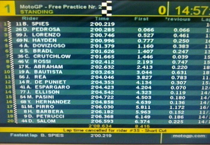 Κατάταξη δεύτερων ελεύθερων δοκιμαστικών (υπό βροχή). 1) Β. Spies 2) D. Pedrosa 3) J. Lorenzo 4) N. Hayden 5) A. Dovizioso 6) S. Bradl 7) C. Crutchlow 8) V. Rossi 9) K. Abraham 10) A. Bautista 11) J. Rea 12) R. De Puniet