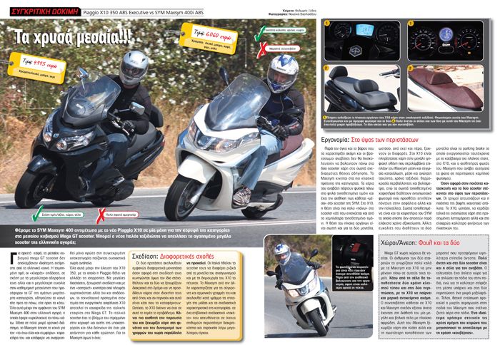 Δύο νέα GT scooter, τα Piaggio X10 350 ABS και SYM Maxsym 400i ABS τίθενται αντιμέτωπα στη συγκριτική δοκιμή του τεύχους.