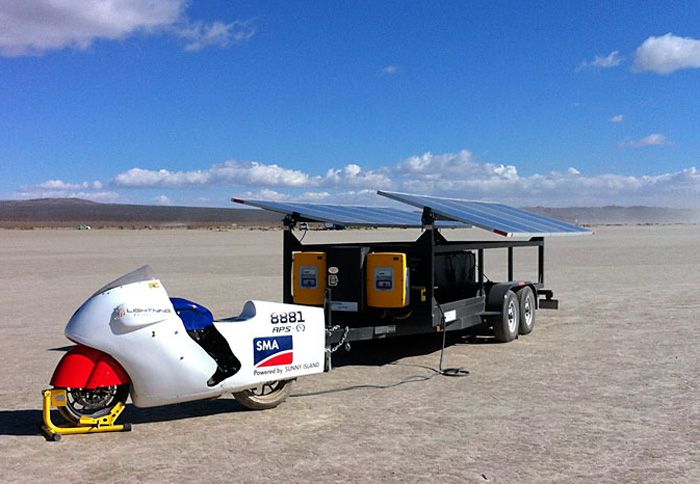 Σε αυτό το ρεκόρ υπάρχουν άλλα τρία στοιχεία που είναι σχεδόν εξίσου εντυπωσιακά. Για την κατάρριψη του η SuperBike (έτσι ονομάζεται) της Lightning Motorcycles φόρτισε τις μπαταρίες της 100%…οικολογικά από ένα τρέιλερ εφοδιασμένο με φωτοβολταϊκά πάνελ και μπαταρίες. Σύμφωνα με τους υπολογισμούς τις εταιρίας αν η φόρτιση γινόταν από μία οικιακή πρίζα θα κόστιζε μόλις 6,7 σεντ του ευρώ για μια προσπάθεια κατάρριψης του ρεκόρ.