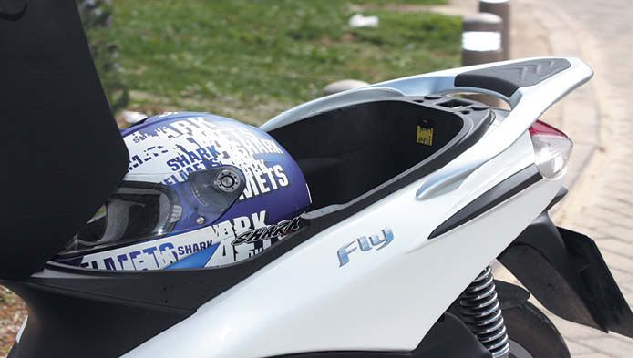 Στον τομέα των χώρων, το Fly προσφέρει περισσότερα απΆ όσα δείχνει. Οι χώροι μοιράζονται στα τέσσερα, με αυτόν που βρίσκεται κάτω από τη σέλα να αποτελεί, όπως είναι φυσικό, τον μεγαλύτερο. Εκεί θα χωρέσουν πλέον δύο jet (αλλά κανένα full face) κράνη, καθώς ο χώρος αυξήθηκε, χάρη στη μεταφορά του ρεζερβουάρ της βενζίνης στην ποδιά. Ο δεύτερος χώρος βρίσκεται στο ντουλαπάκι της ποδιάς. Αυτό είναι αρκετά μεγάλο και βαθύ και θα χωρέσει αρκετά μικροπράγματα. Μάλιστα, κλειδώνει κιόλας και ανοίγει αποκλειστικά από τον κεντρικό διακόπτη του scooter.