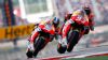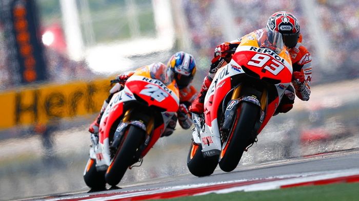 Μόλις «ξεμπέρδεψε» με τον Bradl, ο νεαρός Ισπανός με το νούμερο 93 βάλθηκε να κυνηγάει από κοντά τον ομόσταυλό του, «διαβάζοντας» τον, και κάνοντας υπομονή. Και στον 13ο γύρο, στη στροφή 7, ο Marquez βούτηξε στο εσωτερικό, και η πρώτη θέση άλλαξε χέρια. Ο Pedrosa προσπάθησε να ακολουθήσει τον Marquez που πήγαινε αέρα-πατέρα, ξύνοντας τους αγκώνες τους στις στροφές, όμως δεν κατάφερε να ξαναπεράσει πρώτος, ενώ ένα λάθος στον 19ο γύρο τον έκανε να χάσει λίγο ακόμα χρόνο. Έτσι, στο τέλος του αγώνα, οι άνθρωποι της εργοστασιακής ομάδας της Honda είχαν κάθε λόγο να πανηγυρίζουν, αφού το «στοίχημα» Marquez αποδεικνύεται κίνηση «ματ», ενώ μαζί με τον Pedrosa, η ομάδα έκανε το 1-2 στον αγώνα.