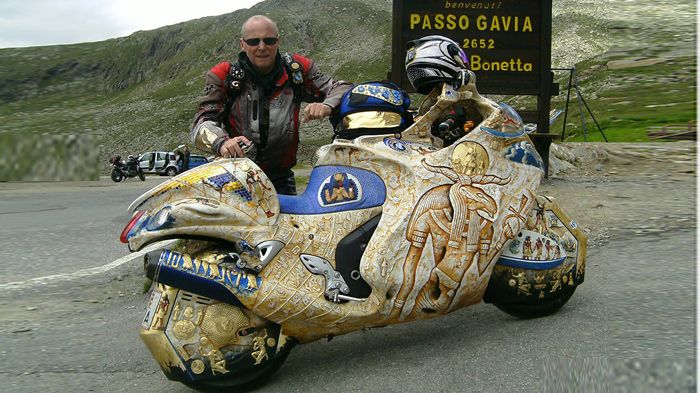 Ο λόγος είναι κάτι παραπάνω από εμφανής με τις ανάγλυφες εικόνες και ιερογλυφικά να συγκλονίζουν με τη λεπτομέρειά τους. Η μοτοσικλέτα που ανήκει προφανώς σε κάποιον λάτρη της αρχαίας Αιγύπτου φωτογραφήθηκε στην κορυφή του Passo Gavia το οποίο βρίσκεται στις Ιταλικές Άλπεις και η συγκεκριμένη φωτογραφία αναρτήθηκε στη σελίδα της περιοχής στο Facebook.