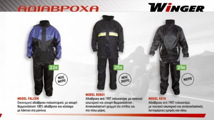 Η Winger προσφέρει ειδικά για τους αναβάτες που επιθυμούν την απόλυτη θωράκιση από το νερό της βροχής, μια σειρά αδιάβροχων φορμών σε συνδυασμό ποιότητας και τιμής που δε θα βρείτε αλλού.